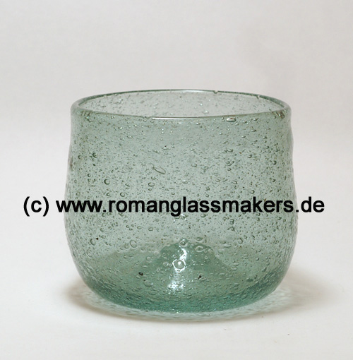 Dieses Glasgefäß ist 2017 von Frank Wiesenberg am holzbefeuerten Experimentalofen GO-Borg-2 im Archäologiepark Römische Villa Borg gefertigt worden.Aufgrund der authentischen Arbeitsbedingungen und der Ofenatmosphäre können diese Gläser im Gegensatz zu den im gasbetriebenen Studioofen gefertigten Stücken vereinzelt Einschlüsse (Holzkohle und Ofenlehm) aufweisen. Aufgrund der kurzen Schmelz- und Läuterungszeit in diesem Experimentalofen sind sie wesentlich blasenreicher als die im Studio gefertigten Stücke.